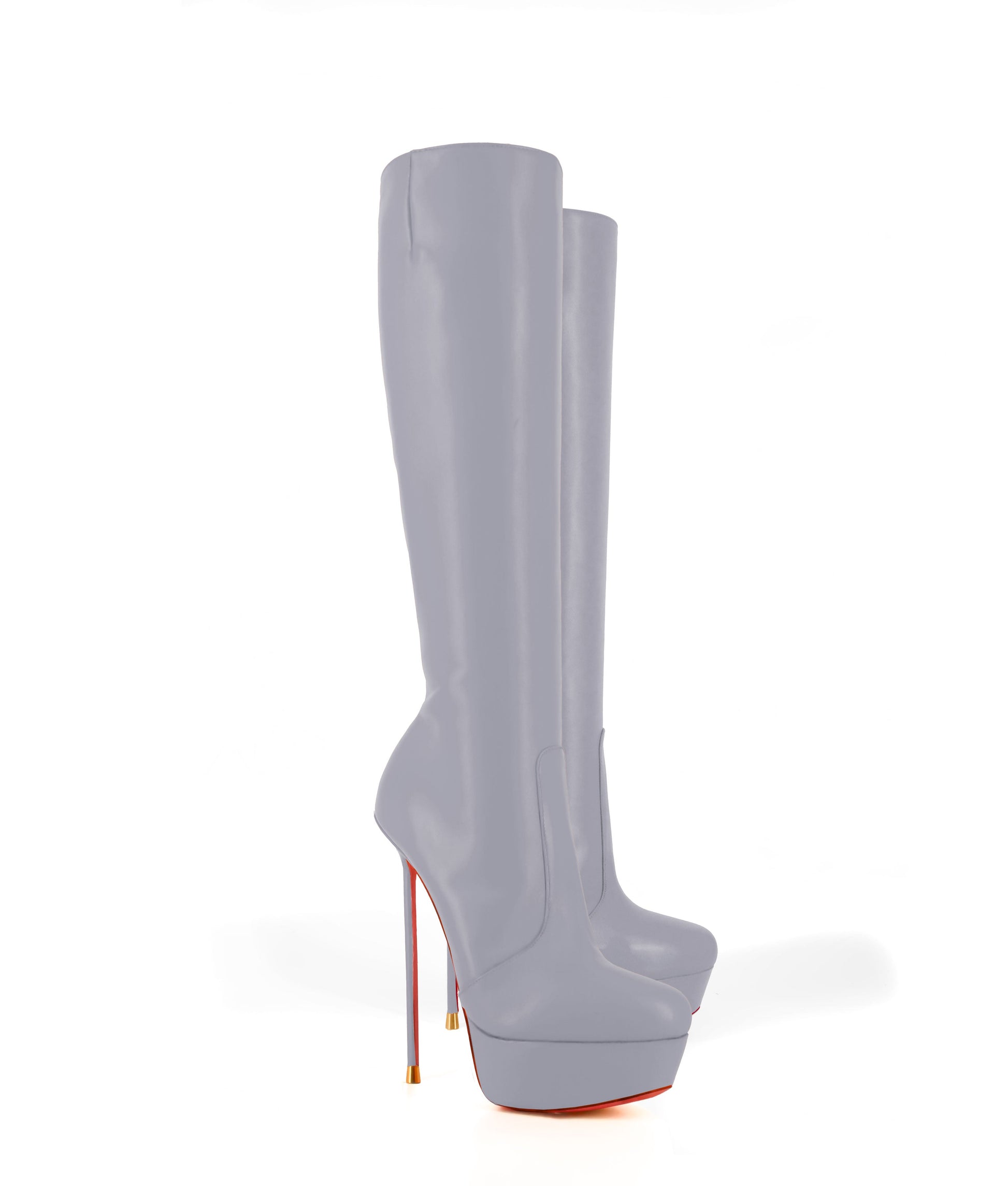 Demona 150 Gray Nappa Knee boots are crafted from genuine soft nappa smooth leather. Knee boots with elegant and versatile style. These boots are made exclusively for each customer so You can choose your favorite custom for them. Choose the sole and inside color and if you prefer the heel leather covered or not. This pair of platform boots is designed with perfect finishes, visible platform and thin stiletto heel.